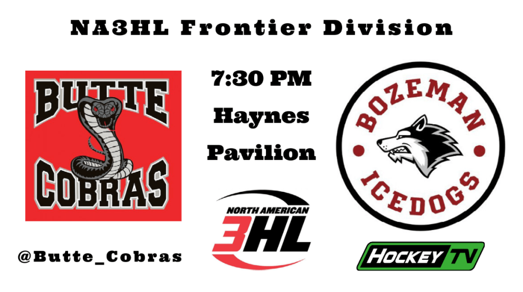 The Butte Cobras (1-12-1-0) head south today to face the Bozeman Icedogs (8-7-1-0) at Haynes Pavilion. Game time is scheduled for 7:30 PM.