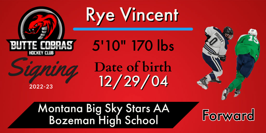 Butte native Rye VIncent has signed a tender to play with the Butte Cobras in 2022-23. The 2004-born forward should provide plenty of grit as he is a player not afraid to do the little things to help his team succeed.