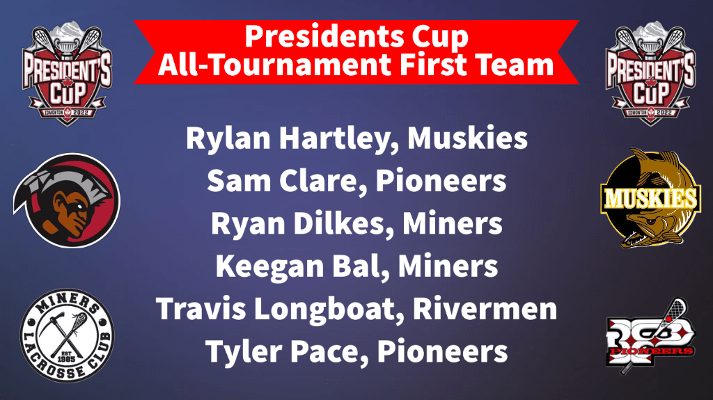Presidents Cup 2022 wrapped up on Saturday night in Edmonton with the Ladner Pioneers capturing the gold medal by defeating Akwesasne Bucks 8-6. Earlier in the day the Six Nations Rivermen defeated Miners Lacrosse Club in in the bronze medal game.