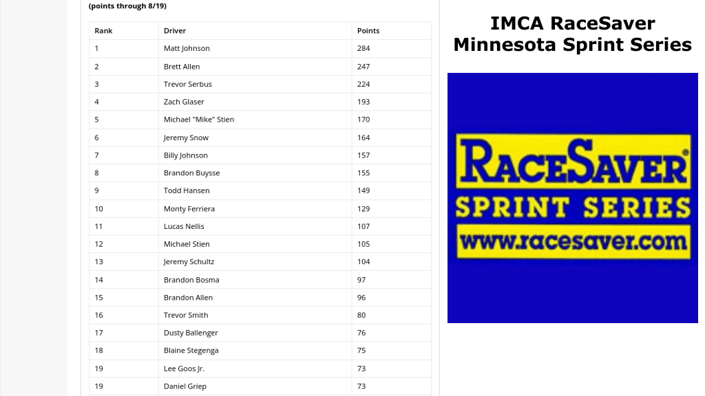 Sprint car driver Matt Johnson claimed a title on August 19 winning the IMCA RaceSaver Minnesota Sprint Series. The 18-year old from St. Peter, Minnesota finished on top with a 37-point margin over former tour champion Brett Allen. 2021 series champion Trevor Serbus finished in third place.