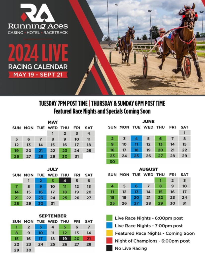 Running Aces Casino, Hotel & Racetrack is pleased to announce its race dates for the 2024 meet, the 17th in track history, which have been approved by the Minnesota Racing Commission.