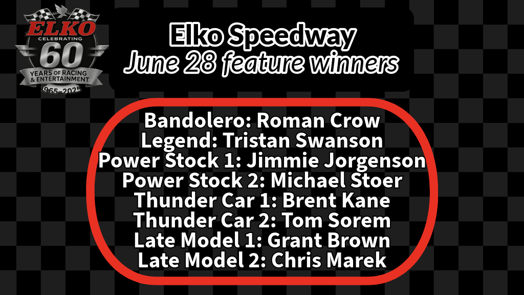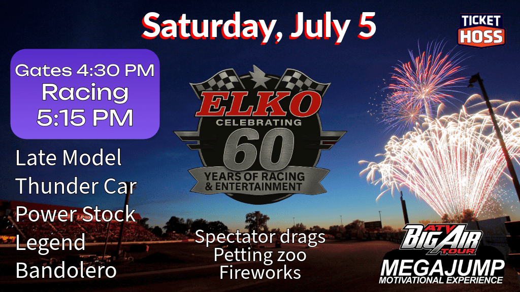 Next up at Elko Speedway is their Fourth of July celebration this Saturday (July 5). Along with regular racing the event will feature the ATV Big Air Tour, Mega Jump Show, a petting zoo with fireworks to end the evening.